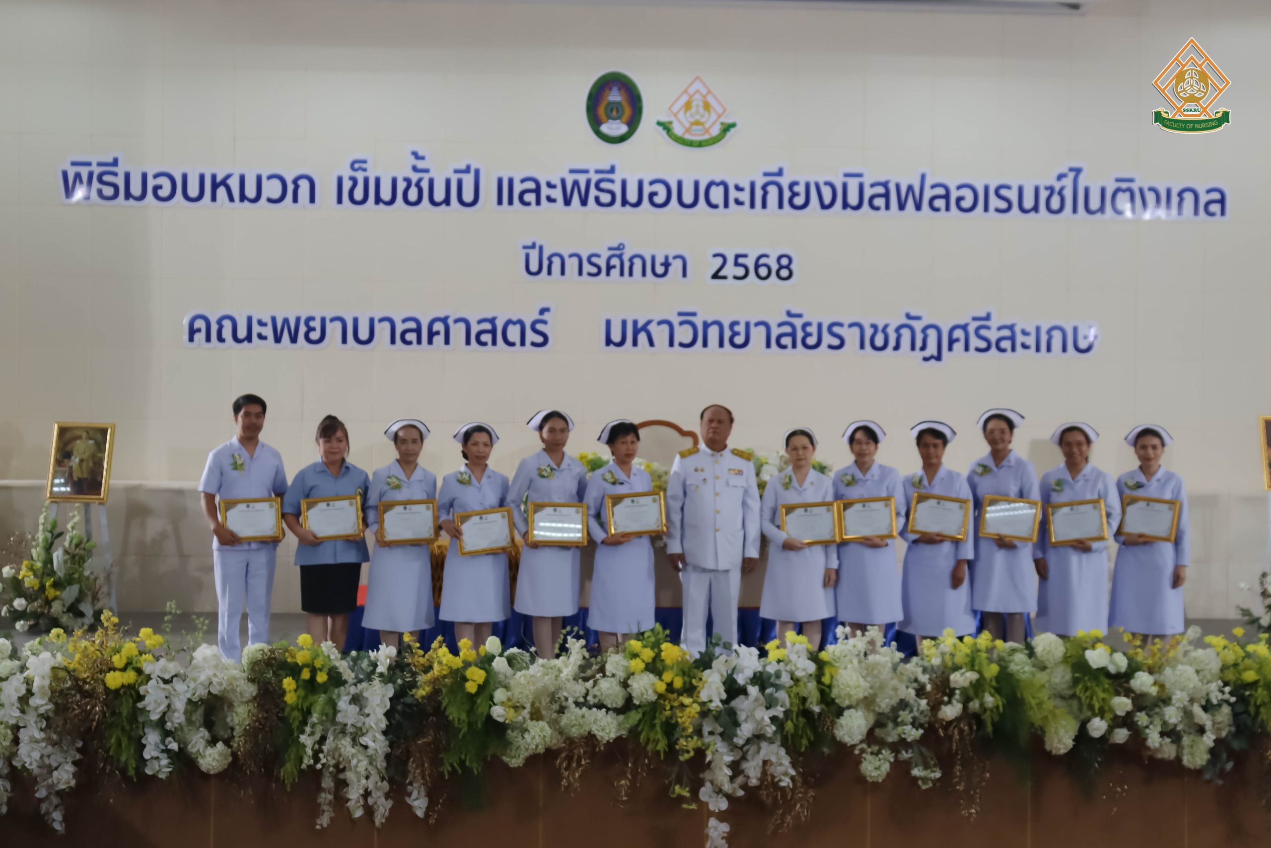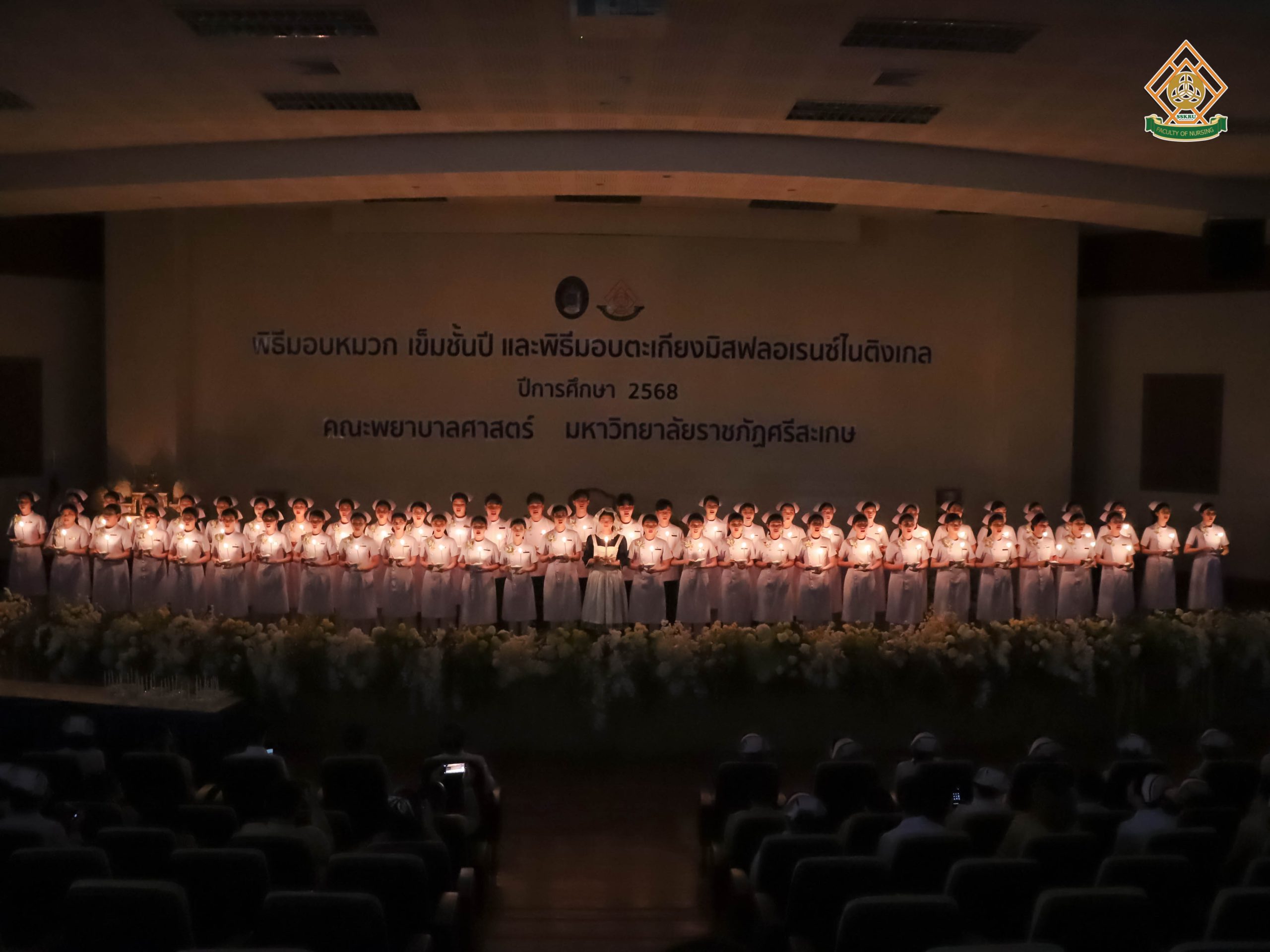 วันที่ 17 ตุลาคม 2568 เวลา 08.30น. ณ ห้องประชุมปีบทอง ชั้น 3 อาคารเรียนและปฏิบัติการวิทยาศาสตร์สุขภาพ คณะพยาบาลศาสตร์ : มหาวิทยาลัยราชภัฏศรีสะเกษ รองศาสตราจารย์ ดร.ประกาศิต อานุภาพแสนยากร อธิการบดีมหาวิทยาลัยราชภัฏศรีสะเกษ เป็นประธานในพิธีมอบหมวก เข็มชั้นปีและพิธีมอบตะเกียงมิสฟลอเรสซ์ไนติงเกล ประจำปีการศึกษา 2568 โดยมีหน่วยงานบุคลากรภายนอก และบุคลากรภายในมหาวิทยาลัยให้เกียรติเข้าร่วมพิธีในครั้งนี้ ซึ่งคณะพยาบาลศาสตร์ได้จัดพิธีดังกล่าวให้กับนักศึกษาชั้นปีที่ 2 รุ่นที่ 3 เพื่อส่งเสริมให้อาจารย์ นักศึกษามีส่วนร่วมในการอนุรักษ์ ทำนุบำรุงศิลปวัฒนธรรมของวิชาชีพพยาบาล ส่งเสริมให้นักศึกษาพยาบาล ตระหนักถึงคุณค่าของวิชาชีพการพยาบาล ส่งเสริมให้นักศึกษาเกิดจิตสำนึกศรัทธาเชื่อมั่นในวิชาชีพพยาบาลและสถาบัน วันเดียวกันนี้คณะพยาบาลศาสตร์ยังได้จัดพิธีมอบเกียรติบัตรพยาบาลวิชาชีพดีเด่น อาจารย์พยาบาลดีเด่นในด้านต่างๆเพื่อเป็นขวัญและกำลังใจที่ สะท้อนถึงความมุ่งมั่น ทุ่มเทในวิชาชีพของผู้ที่ได้รับรางวัล และพิธีมอบเกียรติบัตรขอบคุณผู้ให้ทุนการศึกษากับนักศึกษาคณะพยาบาลศาสตร์ เพื่อแสดงความขอบคุณขอบคุณและยกย่องเชิดชูเกียรติแก่ผู้ให้ทุนกาศึกษาทุกท่าน