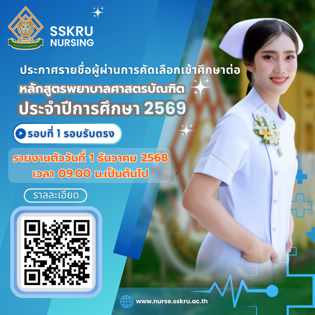 ประกาศรายชื่อผู้ผ่านการคัดเลือก เพื่อเข้าศึกษาต่อ หลักสูตรพยาบาลศาสตรบัณฑิต ประเภทรับตรง (รอบ portfolio) คณะพยาบาลศาสตร์ ประจำปีการศึกษา 2569