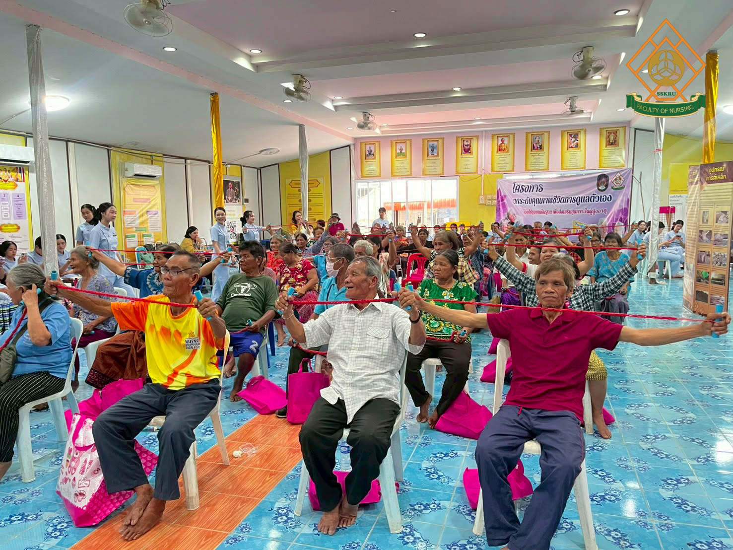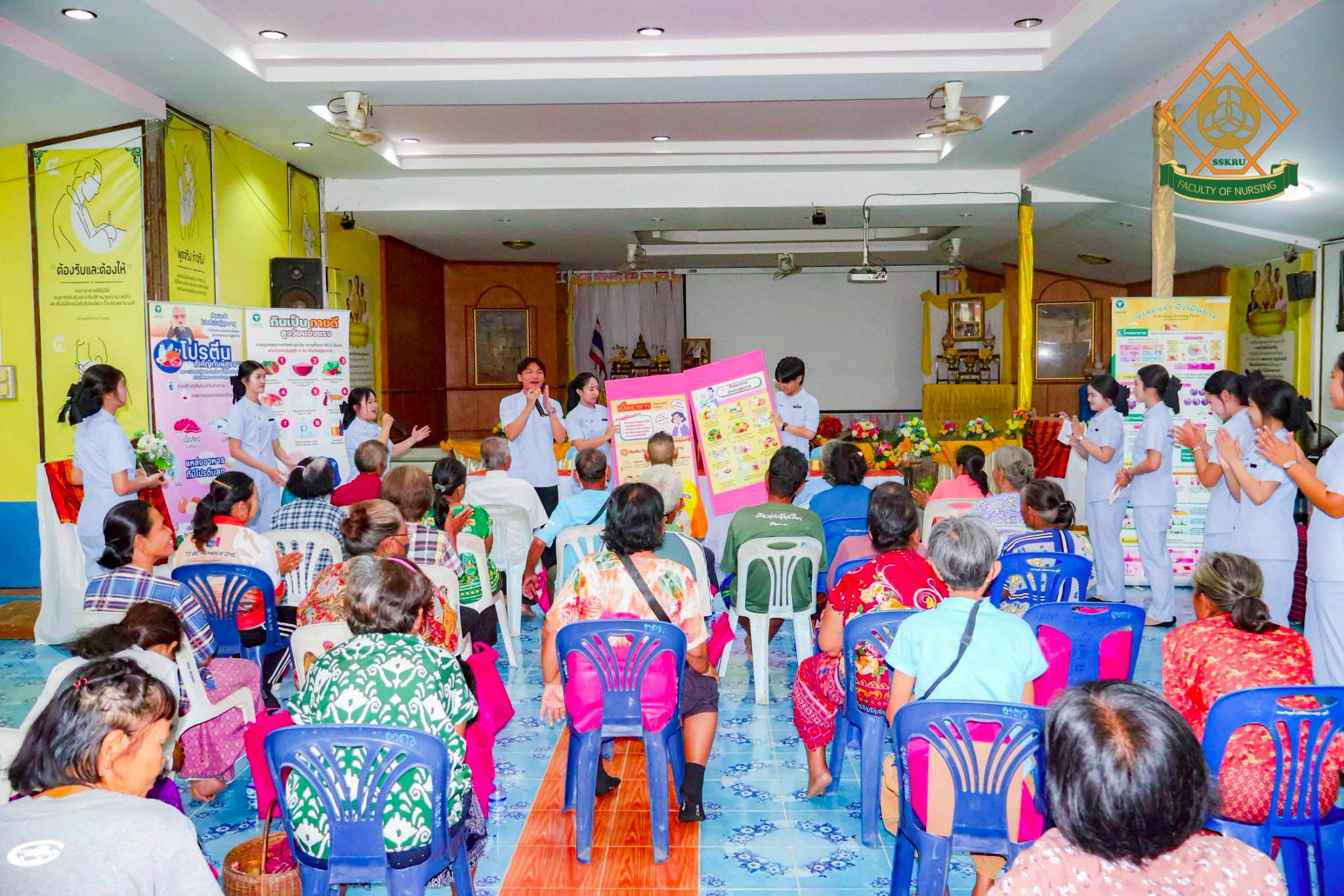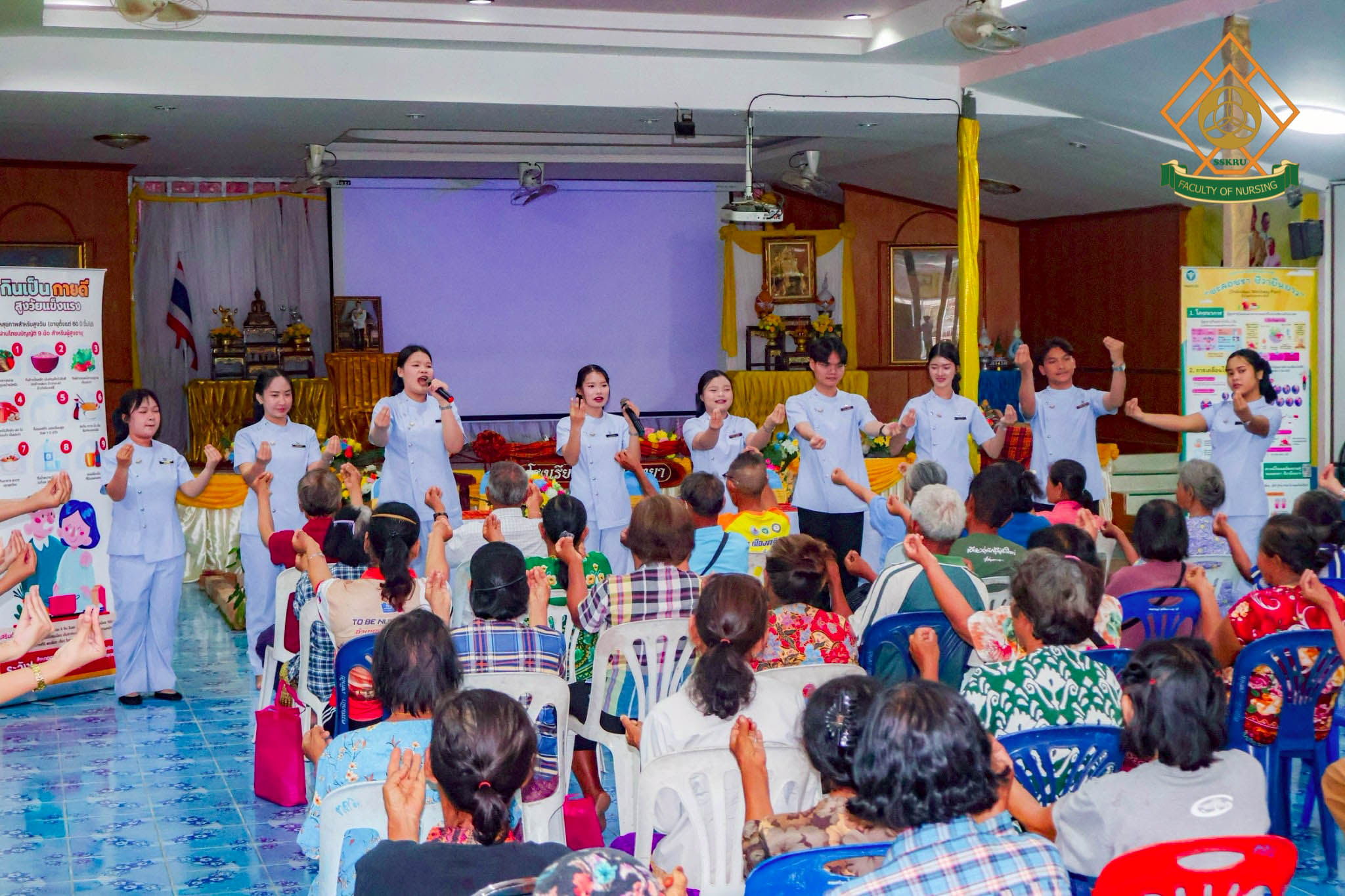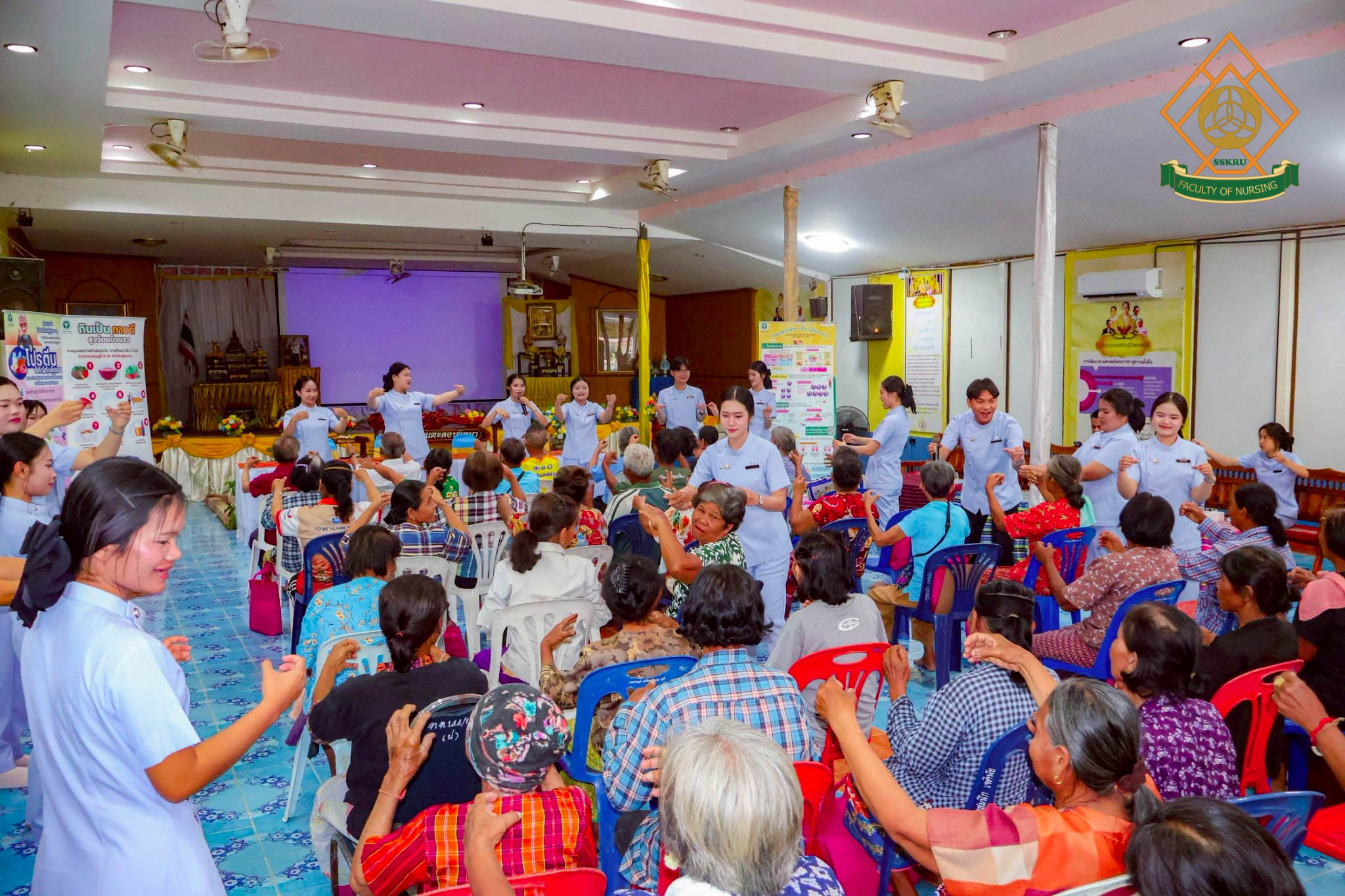 วันที่ 2 มีนาคม พ.ศ. 2569 ณ โรงเรียนตะดอบวิทยา ตำบลตะดอบ อำเภอเมือง จังหวัดศรีสะเกษ คณะพยาบาลศาสตร์ได้จัดโครงการยกระดับคุณภาพชีวิตการดูแลตนเองโดยใช้ชุมชนเป็นฐาน เพื่อส่งเสริมสุขภาวะในผู้สูงอายุ โดยมีวัตถุประสงค์เพื่อพัฒนาศักยภาพผู้สูงอายุในการดูแลสุขภาพตนเอง ส่งเสริมการมีส่วนร่วมของชุมชนและเครือข่ายในพื้นที่ สร้างรูปแบบการส่งเสริมสุขภาวะผู้สูงอายุที่สอดคล้องกับบริบทจังหวัดศรีสะเกษ กิจกรรมอบรมผู้สูงอายุกลุ่ม active aging ซึ่งได้มีการบูรณาการกับการเรียนการสอนในรายวิชาการพยาบาลผู้สูงอายุ โดยนักศึกษาพยาบาล ชั้นปีที่ 2 ร่วมประเมินภาวะสุขภาพผู้สูงอายุ และจัดกิจกรรมส่งเสริมสุขภาพแก่ผู้สูงอายุในด้านการป้องกันภาวะสมองเสื่อม อาหารส่งเสริมสุขภาพผู้สูงอายุ การออกกำลังกายในผู้สูงอายุ การป้องกันการหกล้มในผู้สูงอายุ การป้องกันภาวะมวลกล้ามเนื้อน้อย และภาวะเปราะบาง