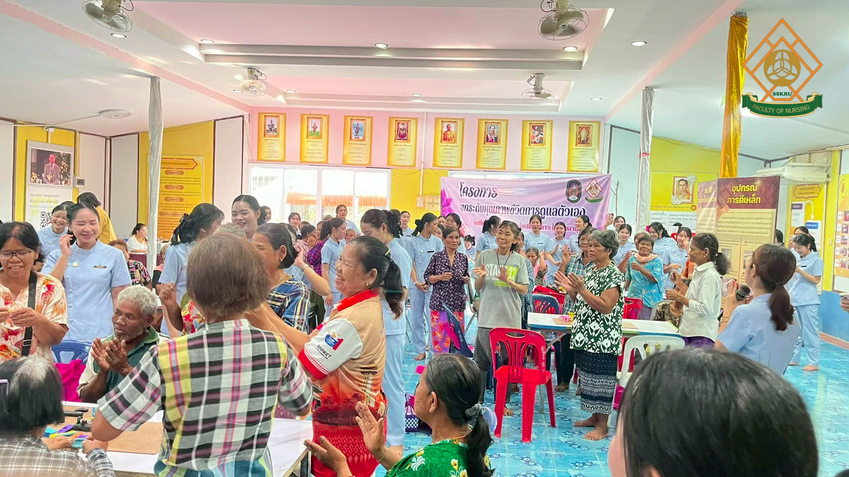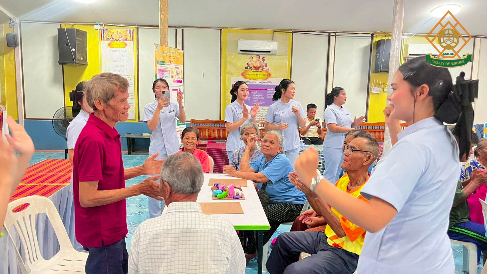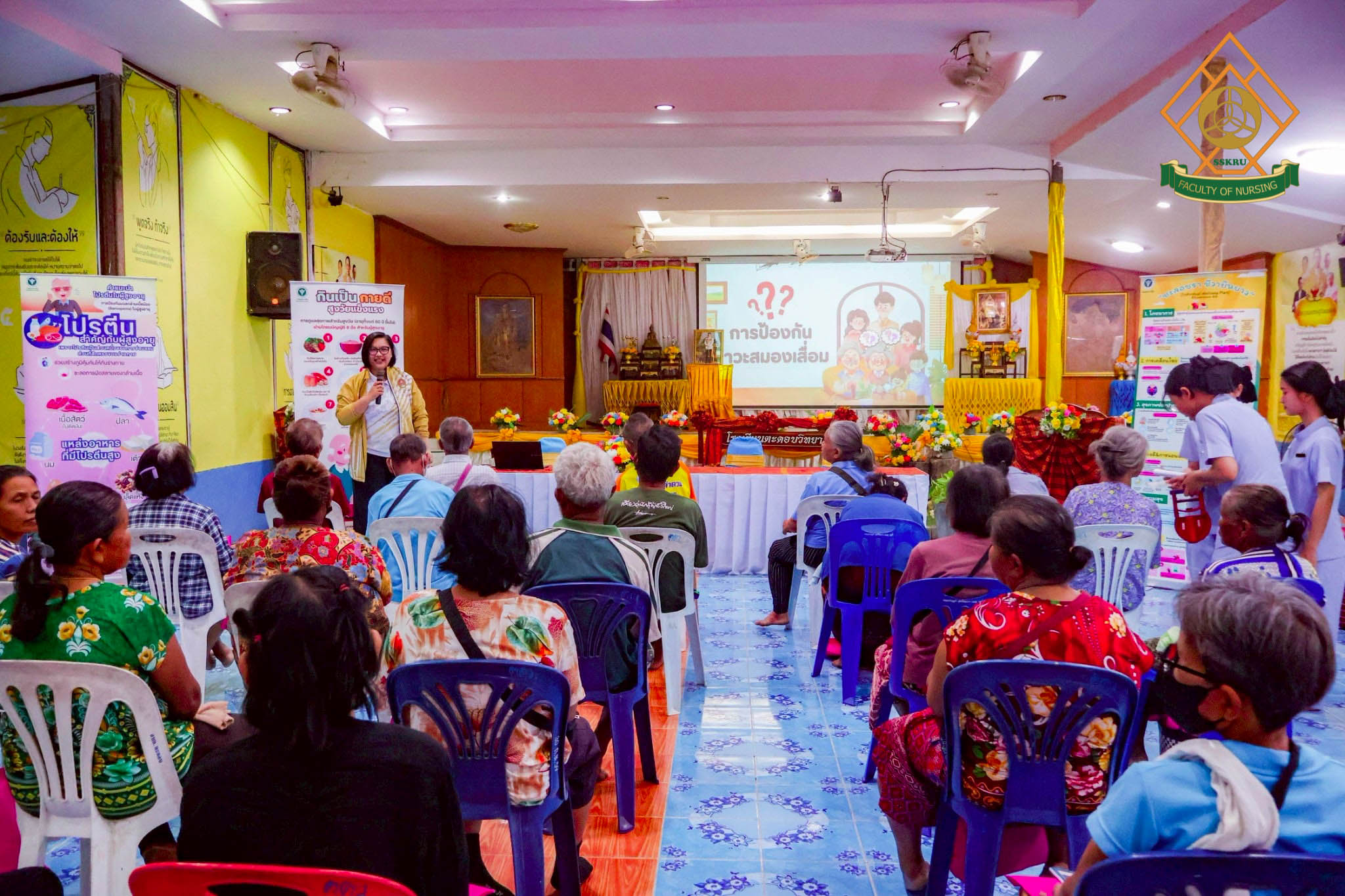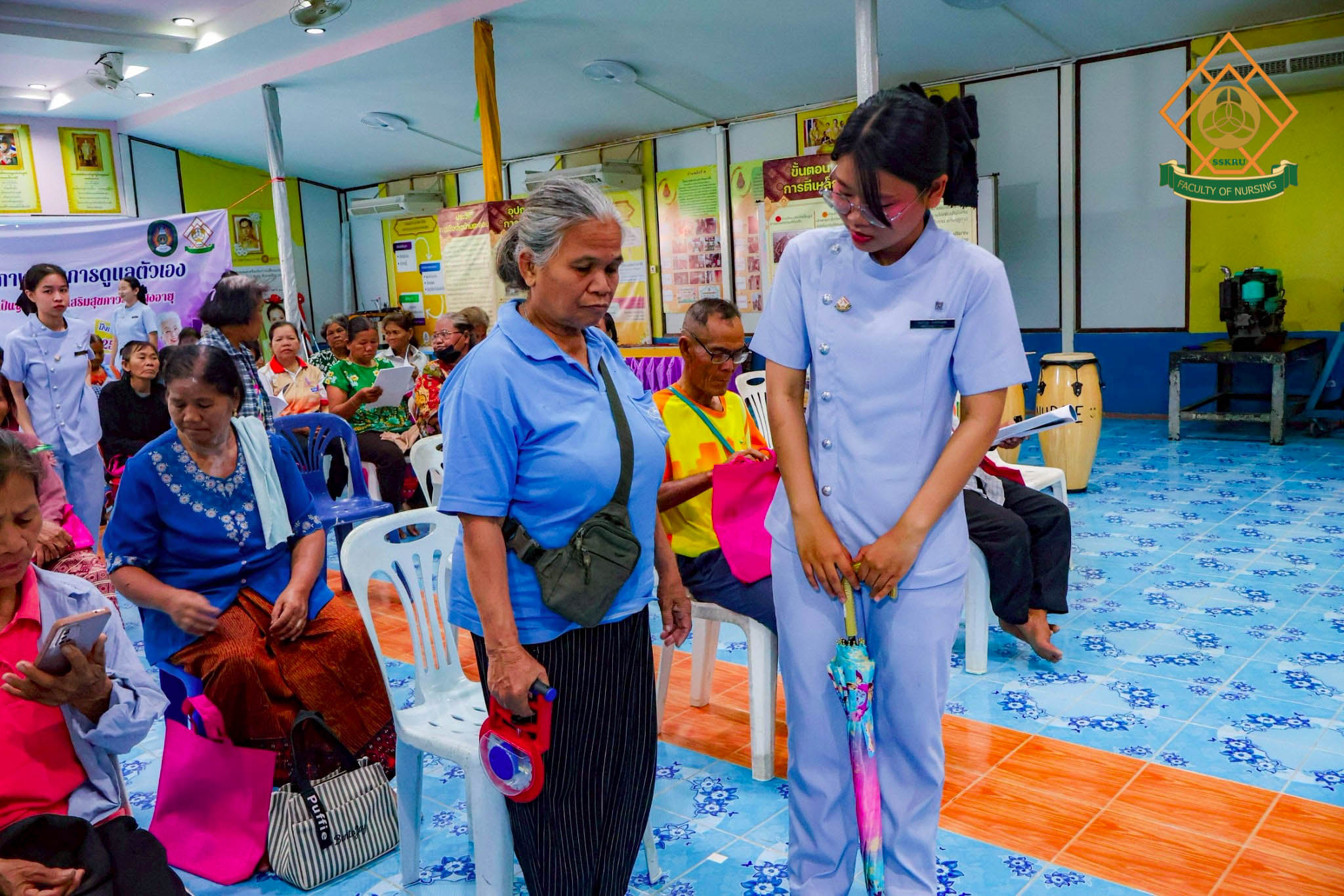 วันที่ 2 มีนาคม พ.ศ. 2569 ณ โรงเรียนตะดอบวิทยา ตำบลตะดอบ อำเภอเมือง จังหวัดศรีสะเกษ คณะพยาบาลศาสตร์ได้จัดโครงการยกระดับคุณภาพชีวิตการดูแลตนเองโดยใช้ชุมชนเป็นฐาน เพื่อส่งเสริมสุขภาวะในผู้สูงอายุ โดยมีวัตถุประสงค์เพื่อพัฒนาศักยภาพผู้สูงอายุในการดูแลสุขภาพตนเอง ส่งเสริมการมีส่วนร่วมของชุมชนและเครือข่ายในพื้นที่ สร้างรูปแบบการส่งเสริมสุขภาวะผู้สูงอายุที่สอดคล้องกับบริบทจังหวัดศรีสะเกษ กิจกรรมอบรมผู้สูงอายุกลุ่ม active aging ซึ่งได้มีการบูรณาการกับการเรียนการสอนในรายวิชาการพยาบาลผู้สูงอายุ โดยนักศึกษาพยาบาล ชั้นปีที่ 2 ร่วมประเมินภาวะสุขภาพผู้สูงอายุ และจัดกิจกรรมส่งเสริมสุขภาพแก่ผู้สูงอายุในด้านการป้องกันภาวะสมองเสื่อม อาหารส่งเสริมสุขภาพผู้สูงอายุ การออกกำลังกายในผู้สูงอายุ การป้องกันการหกล้มในผู้สูงอายุ การป้องกันภาวะมวลกล้ามเนื้อน้อย และภาวะเปราะบาง