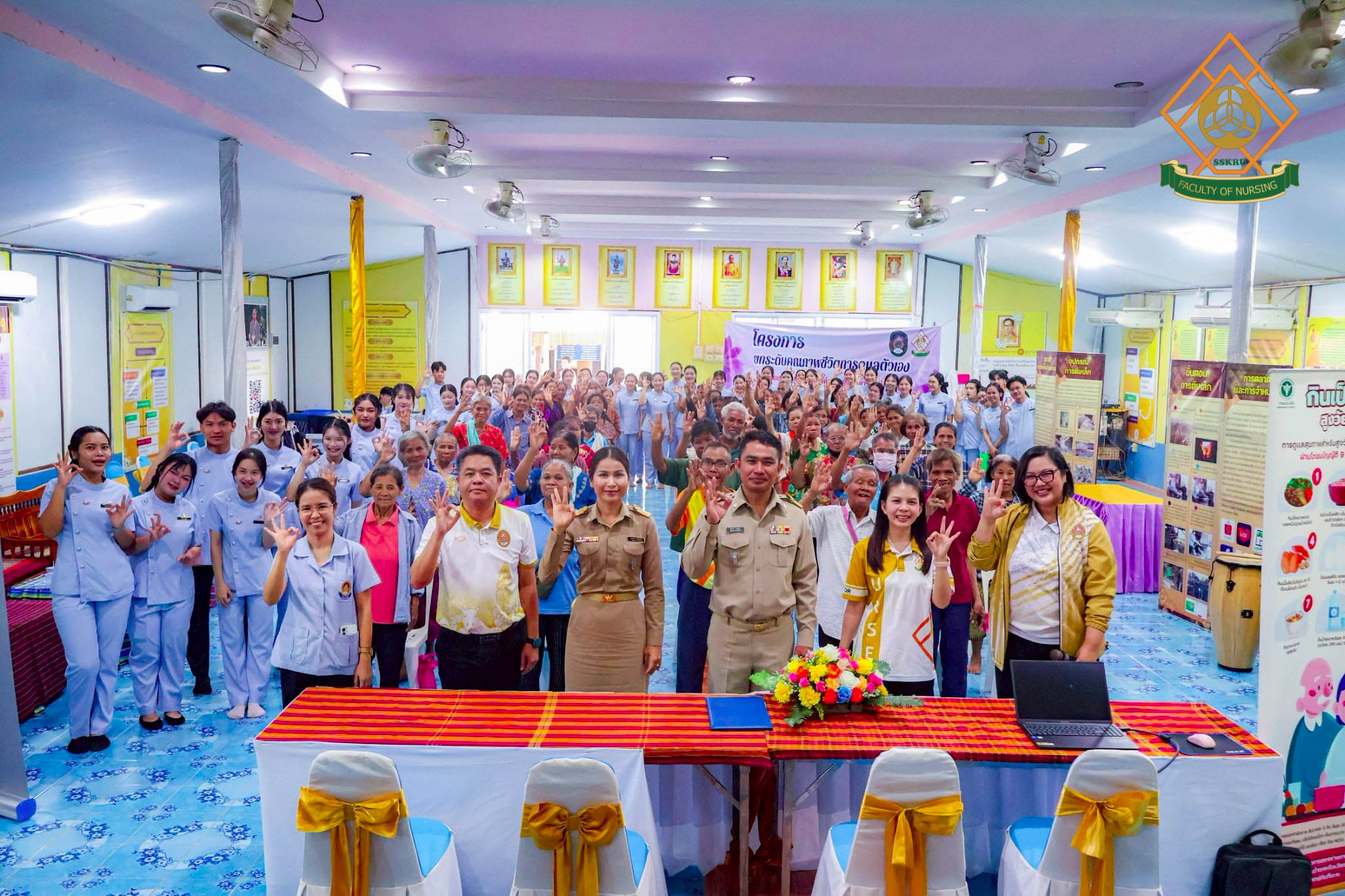 วันที่ 2 มีนาคม พ.ศ. 2569 ณ โรงเรียนตะดอบวิทยา ตำบลตะดอบ อำเภอเมือง จังหวัดศรีสะเกษ คณะพยาบาลศาสตร์ได้จัดโครงการยกระดับคุณภาพชีวิตการดูแลตนเองโดยใช้ชุมชนเป็นฐาน เพื่อส่งเสริมสุขภาวะในผู้สูงอายุ โดยมีวัตถุประสงค์เพื่อพัฒนาศักยภาพผู้สูงอายุในการดูแลสุขภาพตนเอง ส่งเสริมการมีส่วนร่วมของชุมชนและเครือข่ายในพื้นที่ สร้างรูปแบบการส่งเสริมสุขภาวะผู้สูงอายุที่สอดคล้องกับบริบทจังหวัดศรีสะเกษ กิจกรรมอบรมผู้สูงอายุกลุ่ม active aging ซึ่งได้มีการบูรณาการกับการเรียนการสอนในรายวิชาการพยาบาลผู้สูงอายุ โดยนักศึกษาพยาบาล ชั้นปีที่ 2 ร่วมประเมินภาวะสุขภาพผู้สูงอายุ และจัดกิจกรรมส่งเสริมสุขภาพแก่ผู้สูงอายุในด้านการป้องกันภาวะสมองเสื่อม อาหารส่งเสริมสุขภาพผู้สูงอายุ การออกกำลังกายในผู้สูงอายุ การป้องกันการหกล้มในผู้สูงอายุ การป้องกันภาวะมวลกล้ามเนื้อน้อย และภาวะเปราะบาง